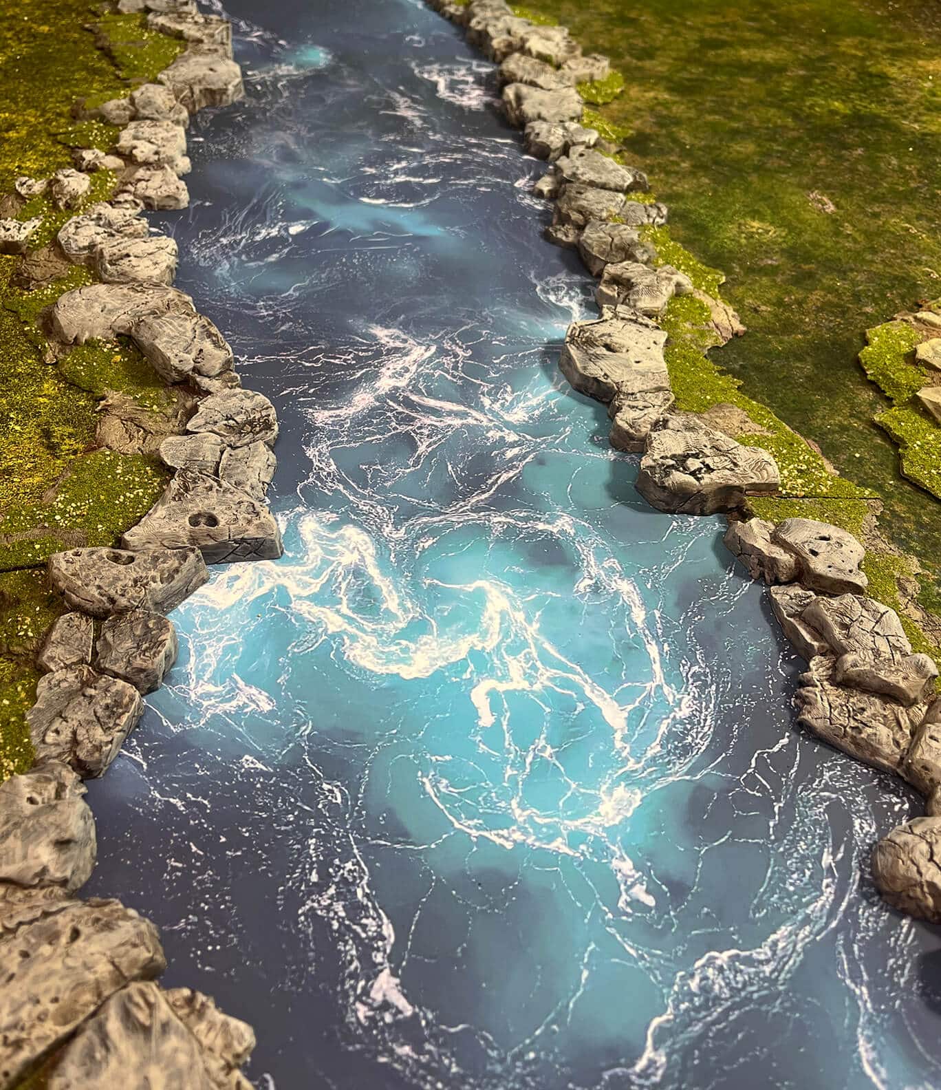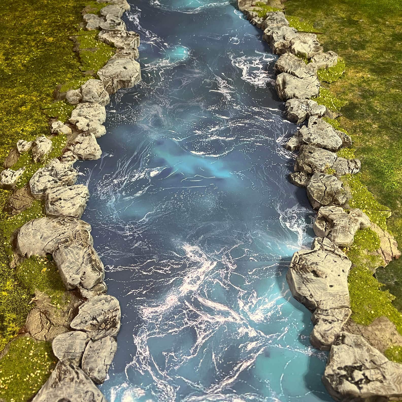 This system uses the 3D printed river back laid on top of a high-resolution image of river water (see image gallery), or you can use a resin pour if you want a more authentic look.