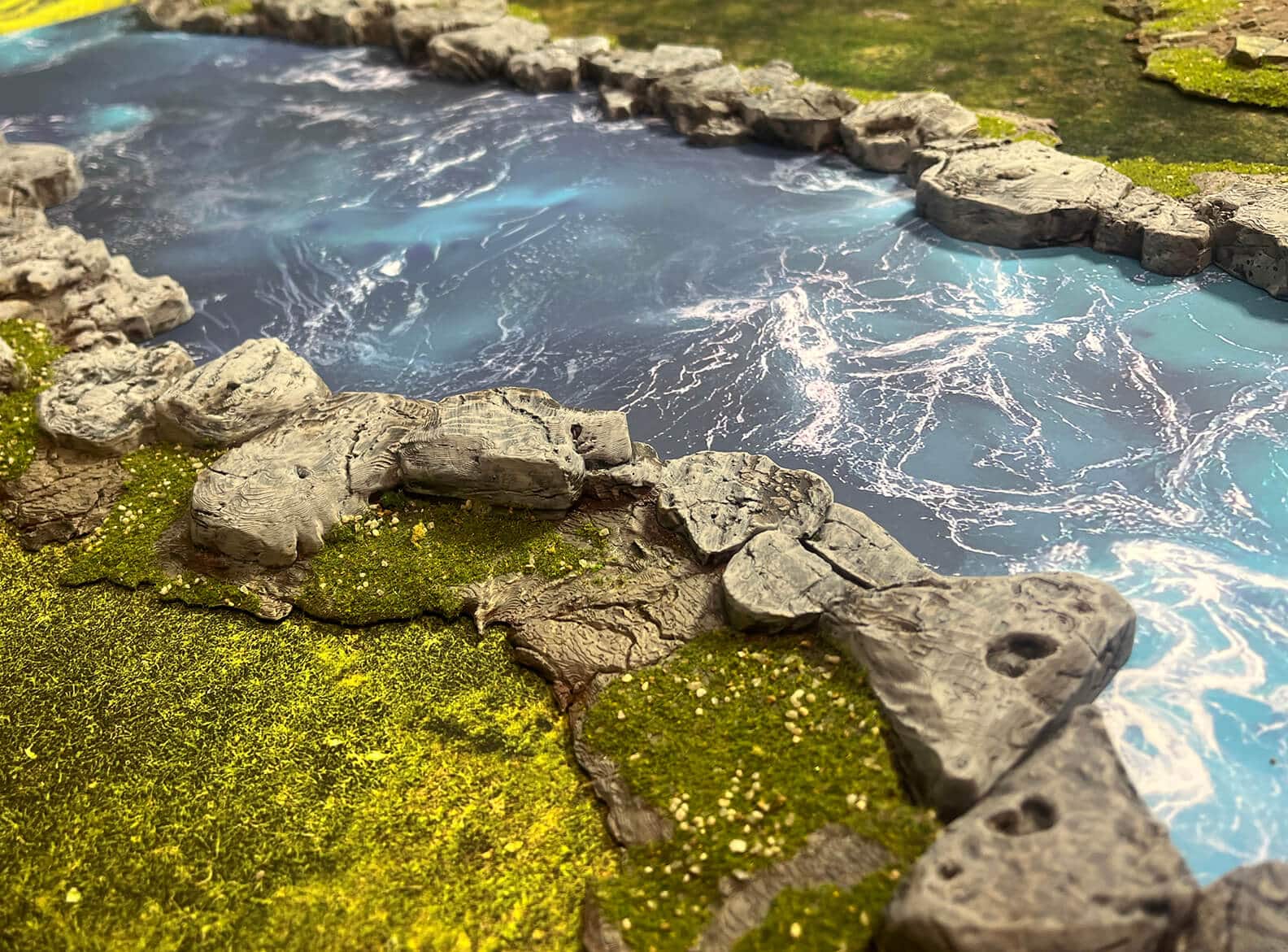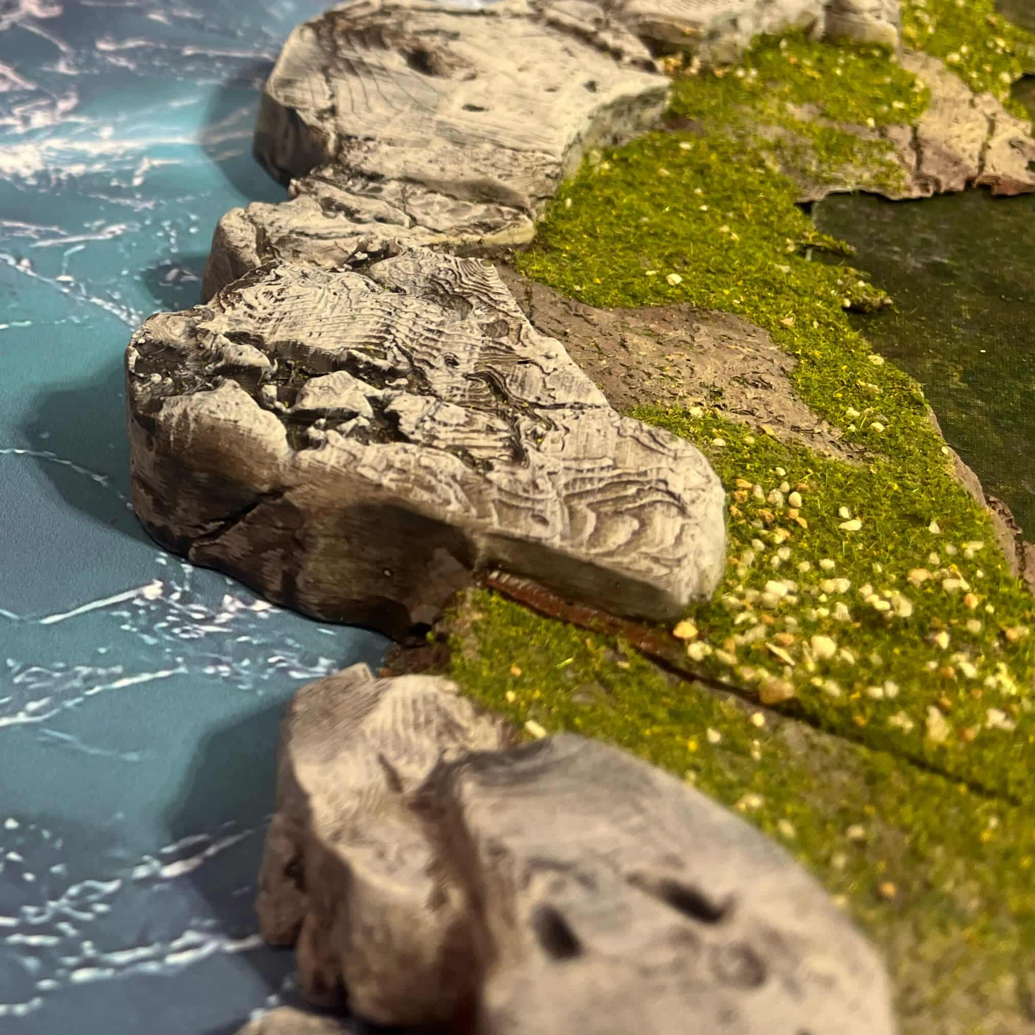 A low profile (meaning, low to the ground so they more easily blend in with your other terrain and textures) river bank set that will allow you to form a multitude of different and random looking river systems on your battlefield, dioramas and table top games.