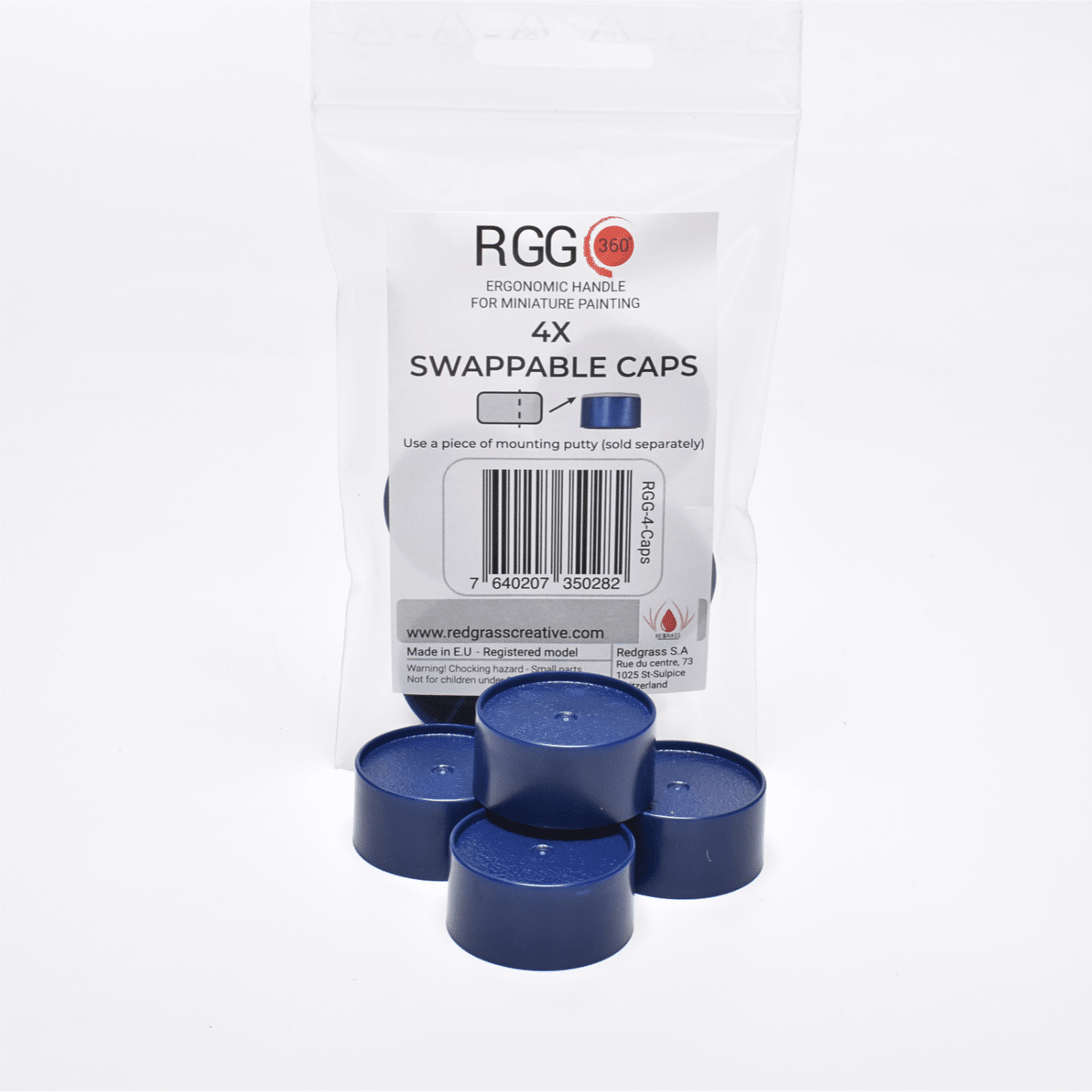 4 swappable caps for the RGG360° miniature holder V2. Swap your miniatures at will, without touching them. Speed up your batch painting.